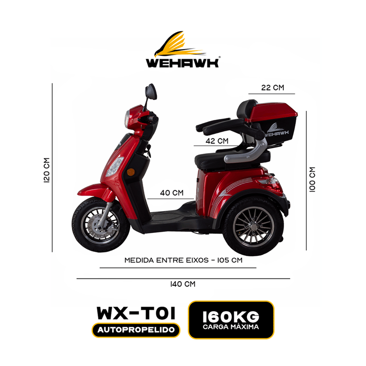 Triciclo Eletrico Mult 3 Wx-T03 Wehawk 800w Bat 48v 20ah Litio 3 Lugares Vermelho